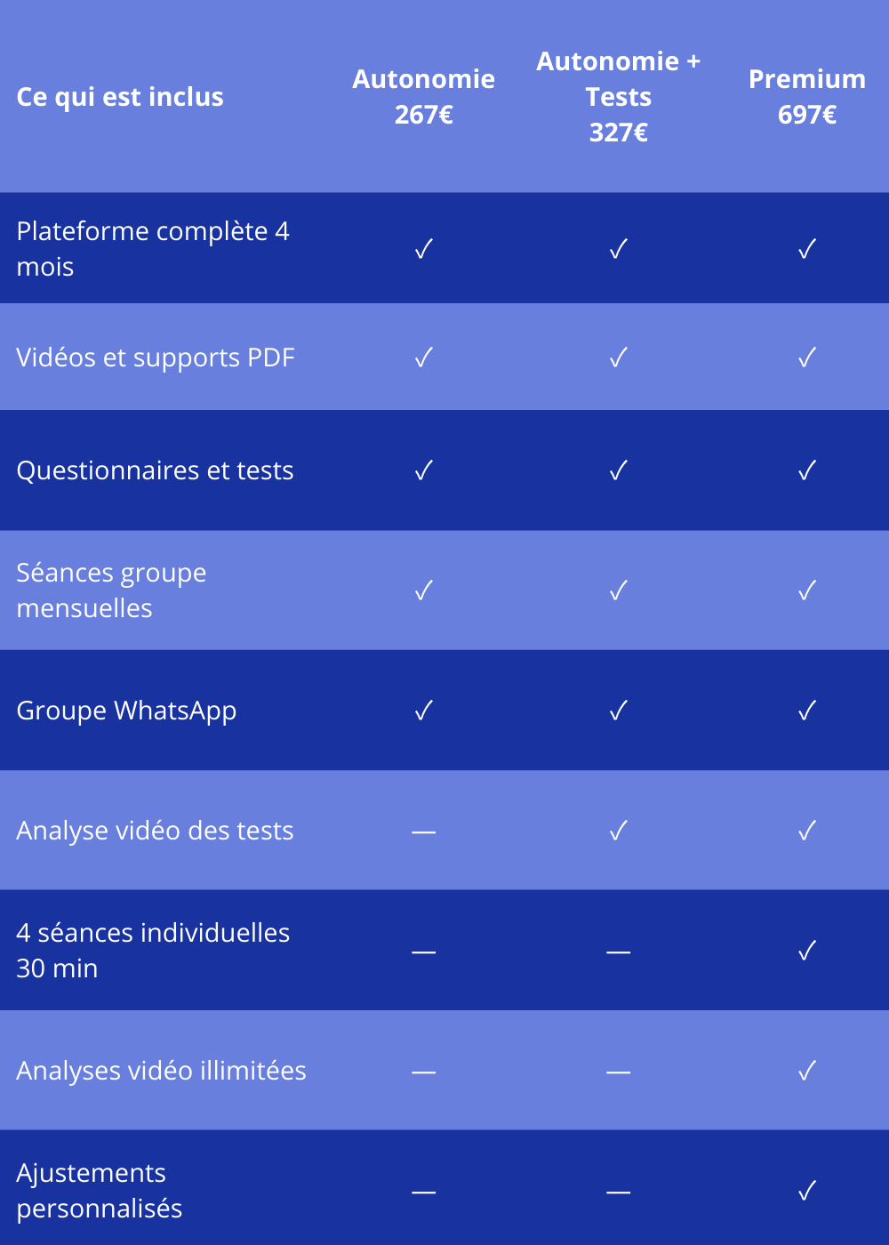 Chaque formule te donne accès à la qualité et à la structure du programme Mouv'n Focus. C'est le niveau de personnalisation qui varie selon tes besoins.